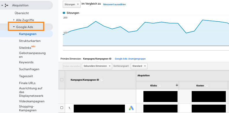 Die Google Ads-Daten findest du nach der Verknüpfung in Google Analytics unter Akquisition -> Google Ads.