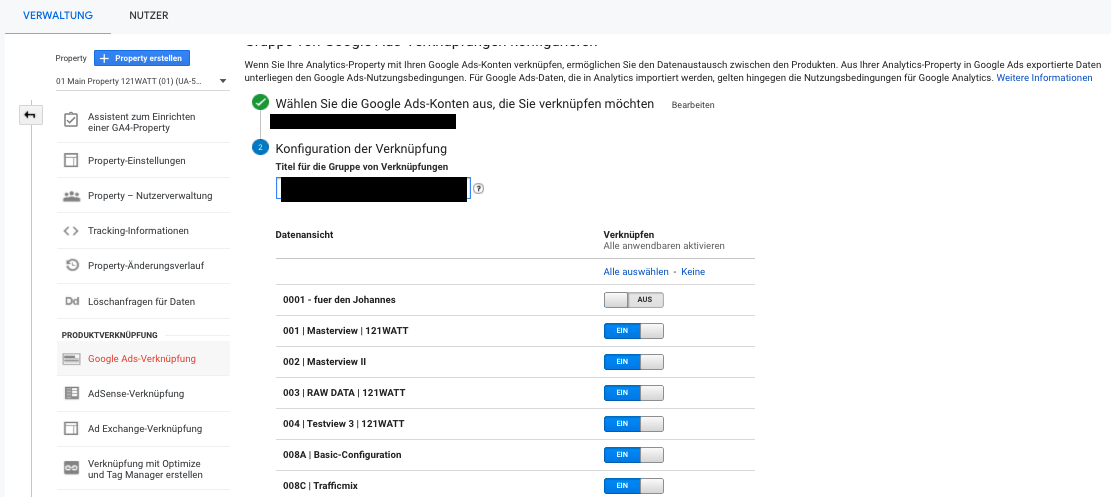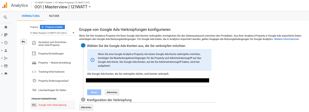Die Verbindung der Services ist im Prinzip sehr einfach und kann in wenigen Minuten erledigt werden. In der Verwaltung von Google Analytics wählst du innerhalb des Kontos die Property aus, die mit Google Ads verbunden werden soll. Danach verknüpfst du das Google Ads -Konto.