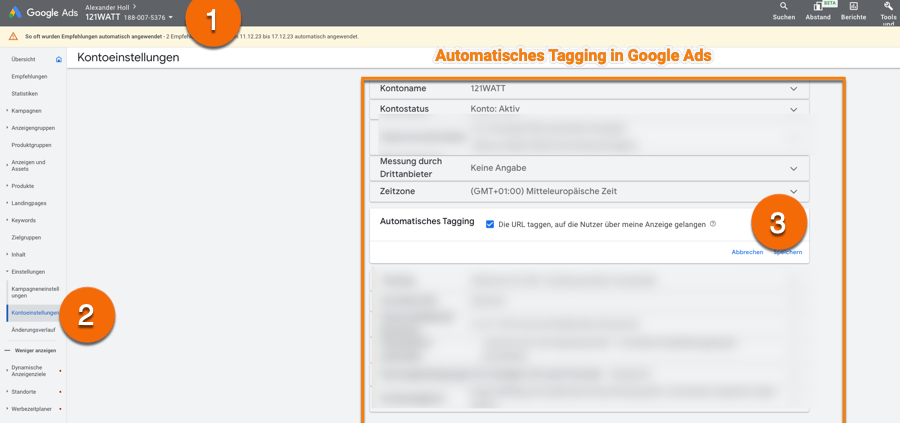 • Du hast Auto-Tagging nicht angeschaltet – > Bitte überprüfe die Verknüpfung hier in deinem Google Ads Konto unter Einstellungen und dann Kontoeinstellungen, wie das aussieht hier im folgenden Screenshot – Mehr dazu hier auch bei Google
