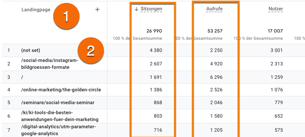 Tipp: Du setzt einen Tabellenfilter auf zum Beispiel Seiten/Sitzungen größer als 1 und wertest dann aus welche zweiten Seiten Nutzer in einer Sitzung aufgerufen haben. So vermeidest du (not set) und siehst sehr schnell, welche Seiten Nutzer in einer Sitzung als zweite aufgerufen haben. (not set) im Berichtsreiter Verhalten -> Zielseite bei sekundärer Dimension auf zweite Seite