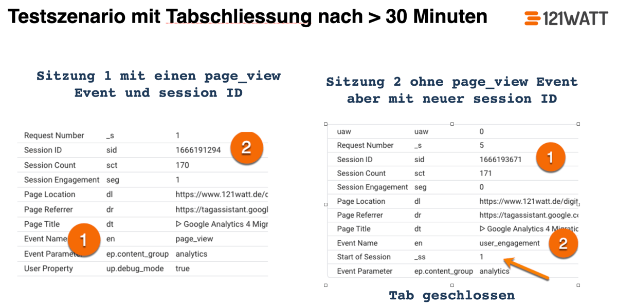 • GA4: 1 Sitzung (session_start) mit einen Ereignis user_engagement,  aber ohne page_view  > Das Ergebnis ∑ 2 Sitzungen mit  nur einem page_view > 2 Sitzungen und 1 Seitenaufruf