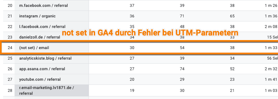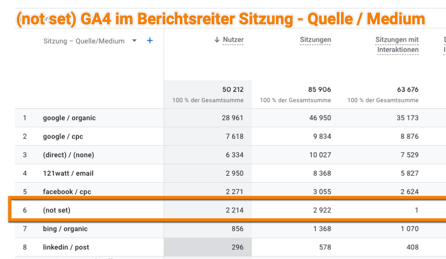 In Google Analytics 4 (GA4)  wird (not set) in Berichten ausgegeben, wenn Google zwar Metriken, wie Sitzungen, zählt, aber keine Daten zur jeweiligen Dimension, wie der Landingpage oder Sitzung – Quelle/Medium, erhalten hat. Je nach Dimension kann dies verschiedene Ursachen haben, z.B. nicht vorhandene Daten, wie GA4 mit bestimmten Ereignissen, wie user_engagement, umgeht, Implementierungsfehler oder Fehler bei der Verwendung von UTM-Parametern/quote]. In diesem Artikel möchte ich dir zeigen, wo (not set) in GA4 auftaucht und wann du handeln solltest.