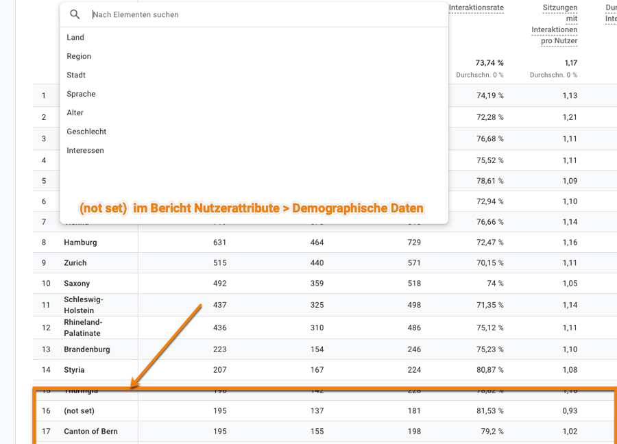 Der Bericht Nutzer > Nutzerattribute und dann in der Auswahl Demografische Daten, sagt dir, wer deine Nutzer sind und verrät dir mehr über ihre Eigenschaften, wie Alter, Geschlecht oder Interessen. Im Dropdown findest du aber auch die Berichte zu Land, region oder Stadt. Diese enthalten meistens (not set)