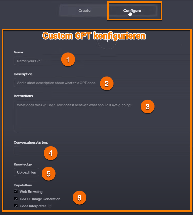 - Configure: Wenn du in den „Configure“ Tab wechselst, sieht du wie ChatGPT deine einzelnen Anweisungen umgesetzt hat.