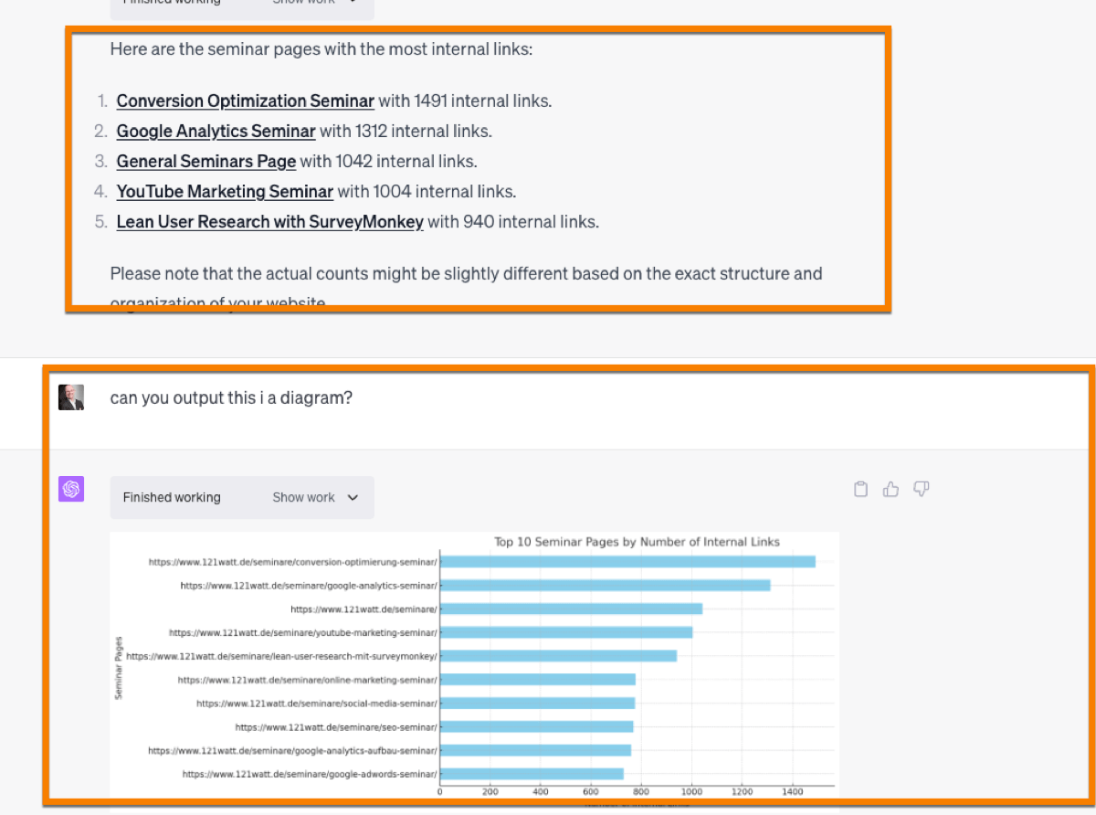 1. Die detaillierte Analyse von Daten aus einem Crawl mit dem ScreamingFrog zur Analyse der internen Verlinkung.