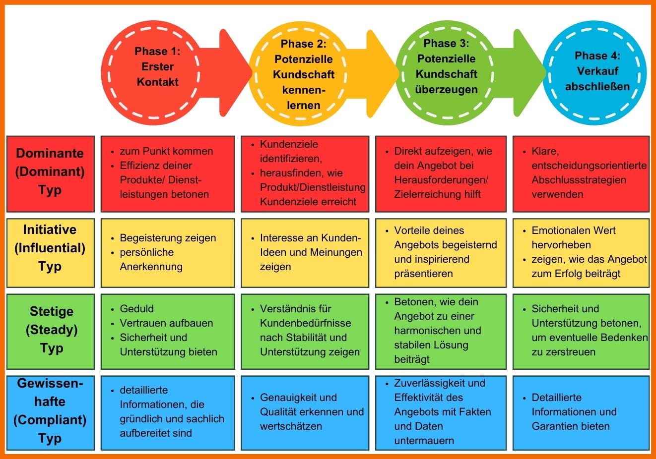 Das DISC-Modell kann dir im B2B-Sales-Prozess in verschiedenen Phasen des Kundengesprächs sehr nützlich sein. Wir zeigen dir exemplarisch ein paar Beispiele, wie du die jeweiligen Typen in den jeweiligen Phasen ansprechen könntest: