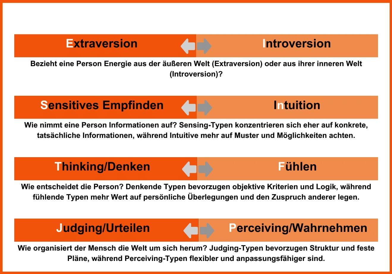 Beachte bitte, dass das MBTI-Modell zwar weit verbreitet ist, aber auch kritisch hinsichtlich seiner wissenschaftlichen Gültigkeit und Zuverlässigkeit zu betrachten ist.