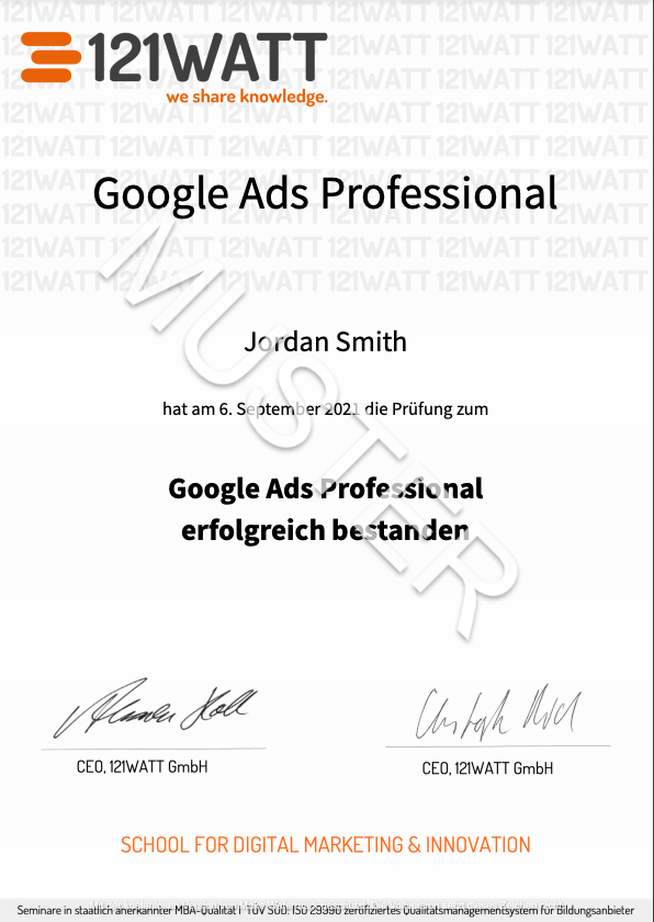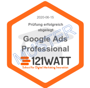 Im Anschluss an die bestandene Prüfung erhältst du das 121WATT-Professional-Zertifikat und ein 121WATT-Badge für deine Website oder dein LinkedIn-Profil. Damit kannst du deine Qualifizierung im Bereich Google Ads nachweisen.
