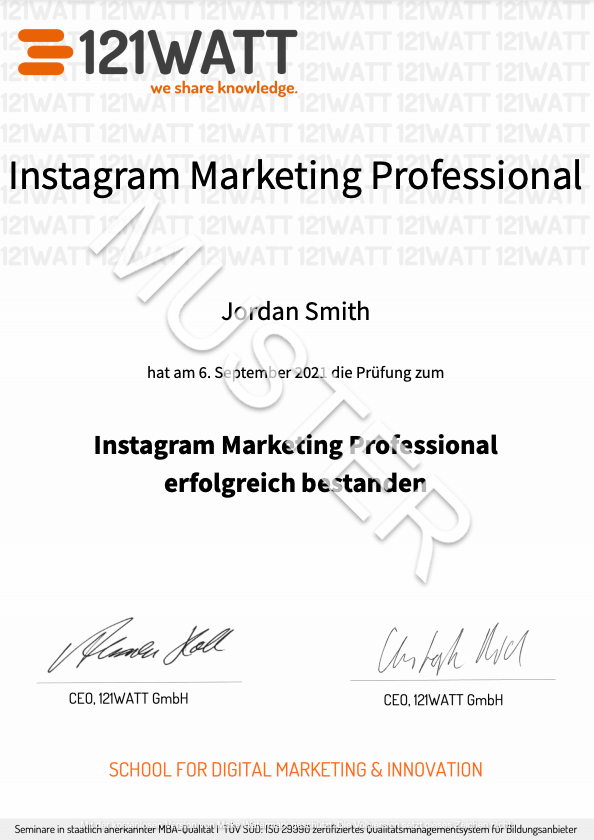 Im Anschluss an die bestandene Prüfung erhältst du das 121WATT-Professional-Zertifikat und ein 121WATT-Badge für deine Website oder dein LinkedIn-Profil. Damit kannst du deine Qualifizierung im Bereich Instagram Marketing nachweisen.