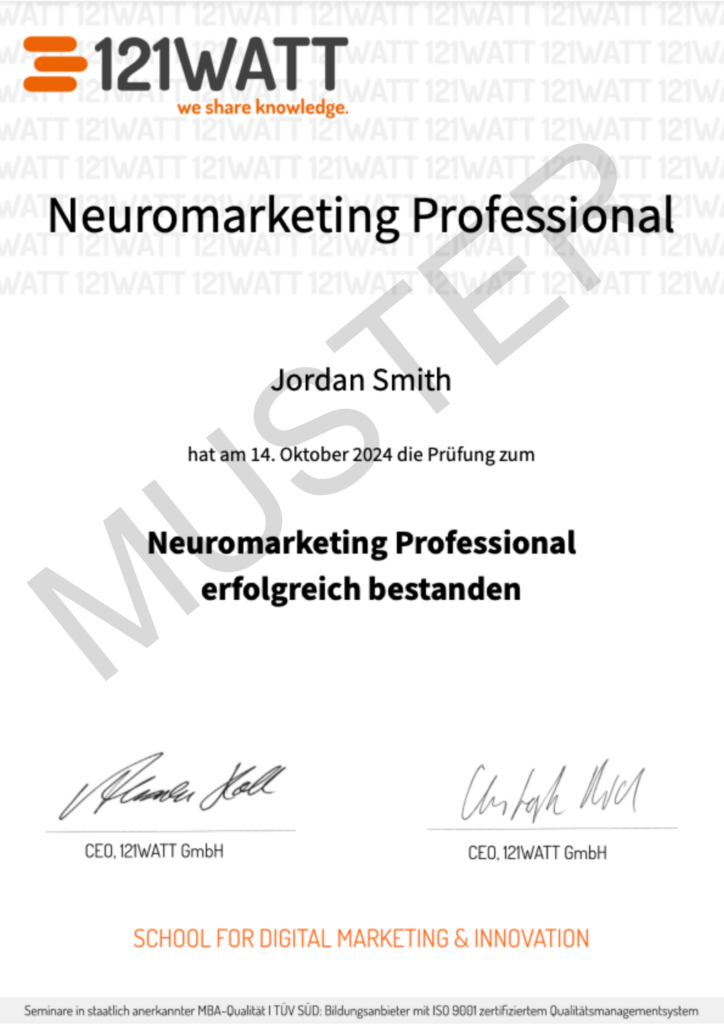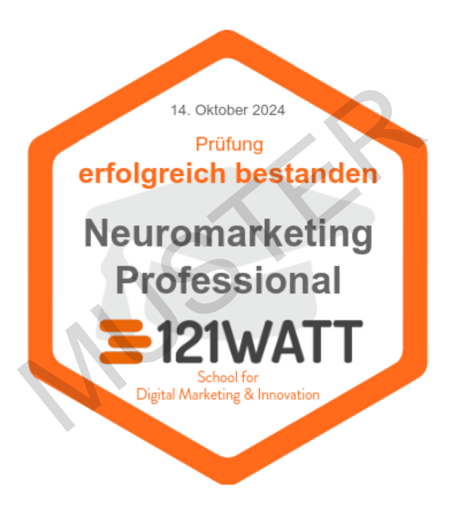 Nach bestandener Prüfung erhältst du das 121WATT-Professional-Zertifikat und ein 121WATT-Badge für deine Website oder dein LinkedIn-Profil. Damit kannst du deine Expertise im Bereich des Neuromarketings & Werbepsychologie nachweisen.