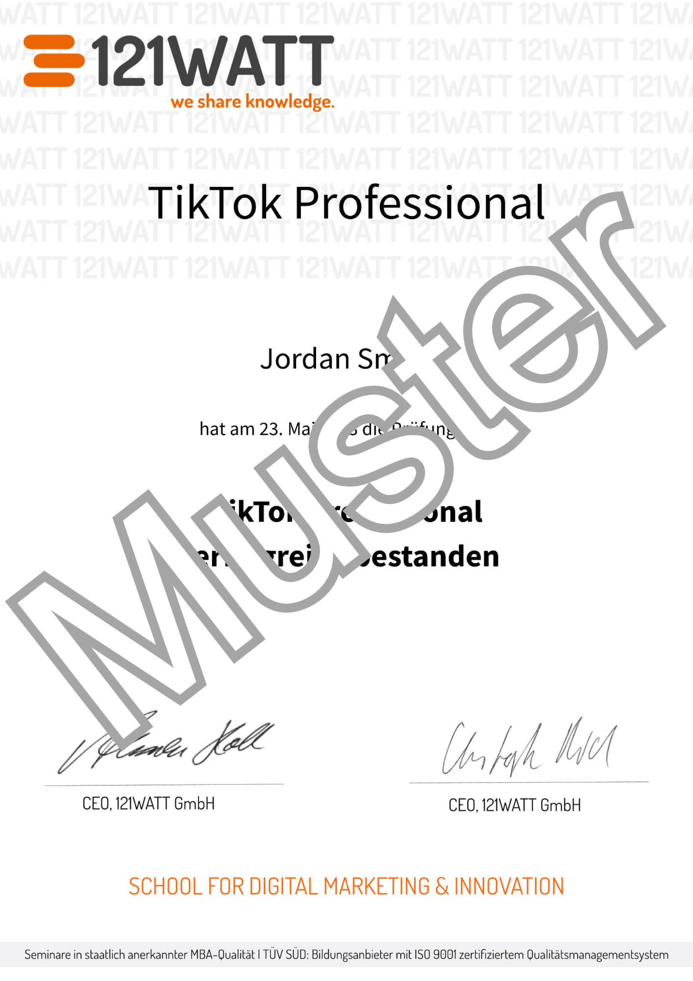 Im Anschluss an die bestandene Prüfung erhältst du das 121WATT-Professional-Zertifikat und ein 121WATT-Badge für deine Website oder dein LinkedIn-Profil. Damit kannst du deine Qualifizierung im Bereich TikTok Marketing nachweisen.