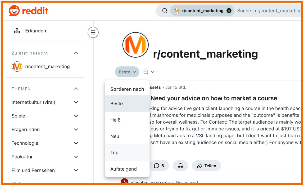 • Sortiere nach Top oder Hot, um zu sehen, welche Themen aktuell viel Resonanz erzeugen.
