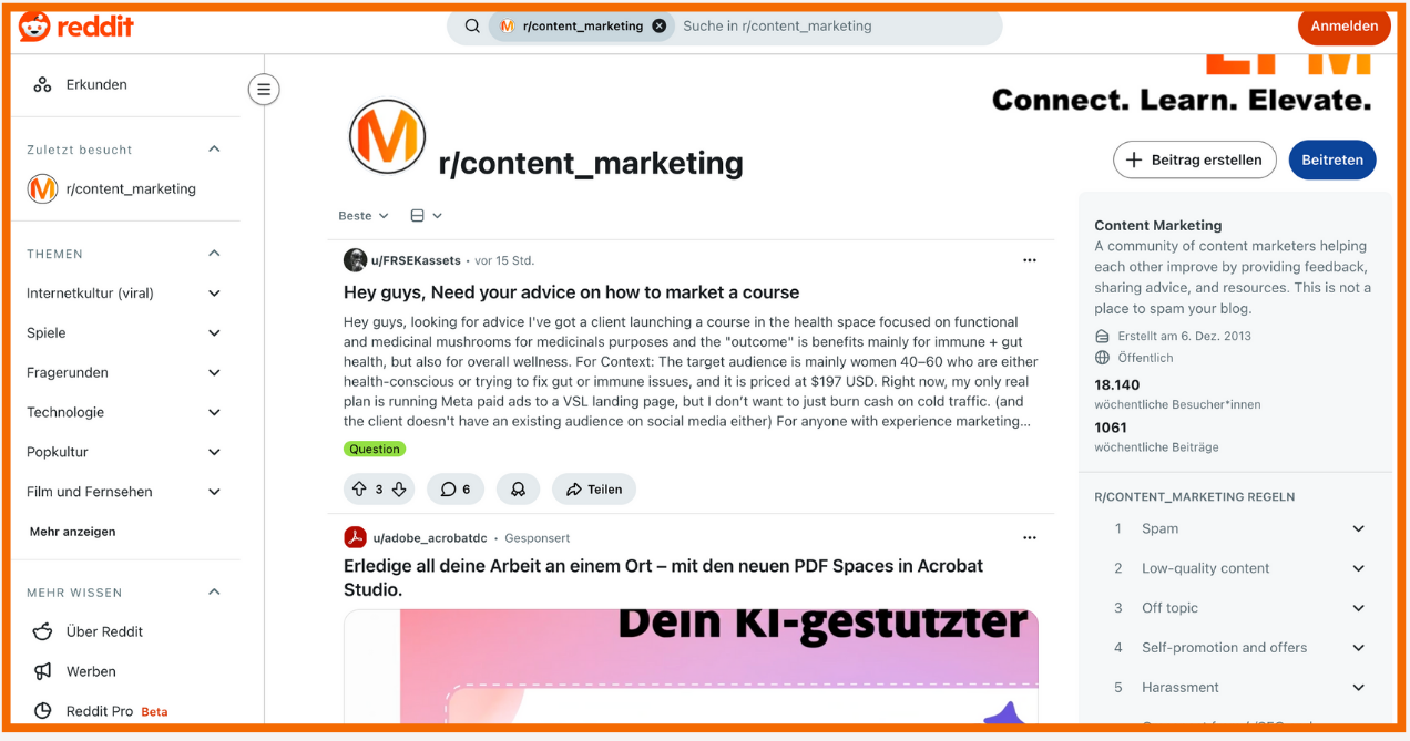 /r/SEO, /r/content_marketing oder /r/socialmedia (Fachcommunities)