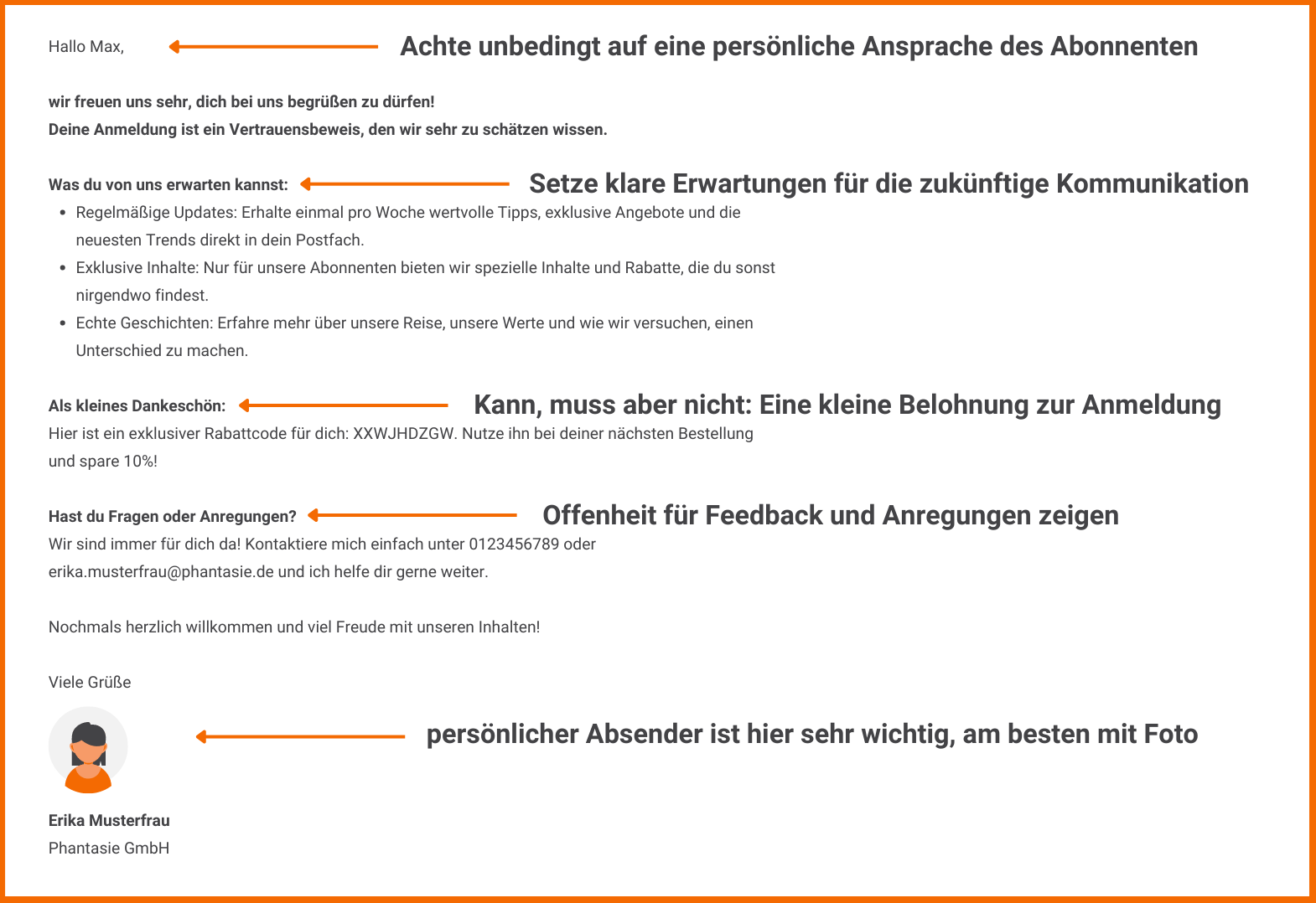 Nimm dir gerne folgenden Vorlage als Beispiel, wenn du dich für eine Begrüßungsmail entscheiden solltest: