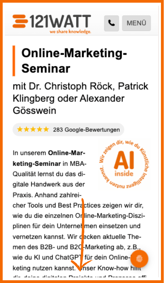 Durch Elemente wie Seitenbalken, welche in der Mitte abgeschnitten werden, siehst du, dass die 121WATT Website noch weiter geht.