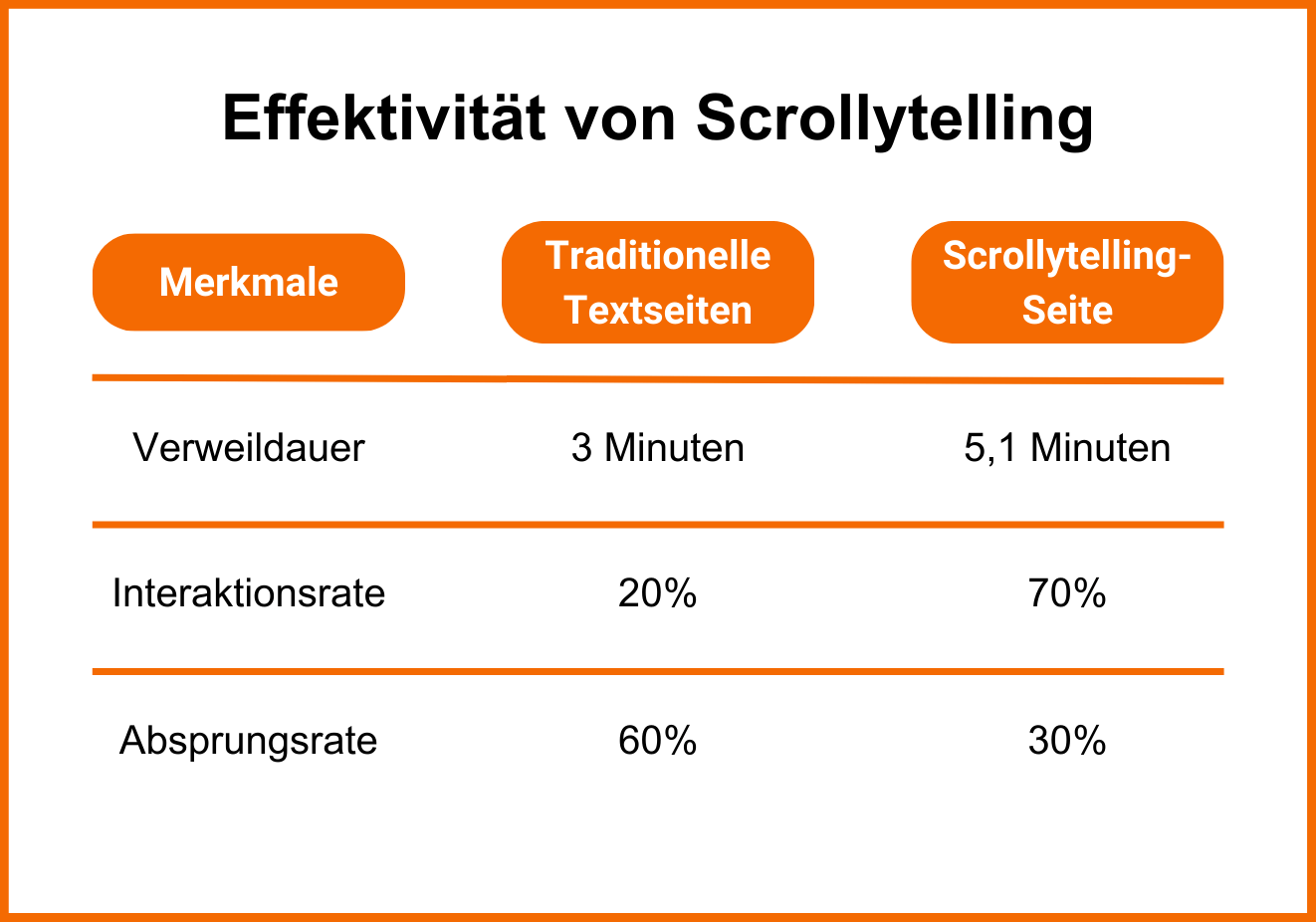 Ergebnisse einer Studie zu der Effektivität von Scrollytelling, welche das Nutzerverhalten auf herkömmlichen Websites zu Scrollytelling-Websites verglich. Quelle: Copymate.