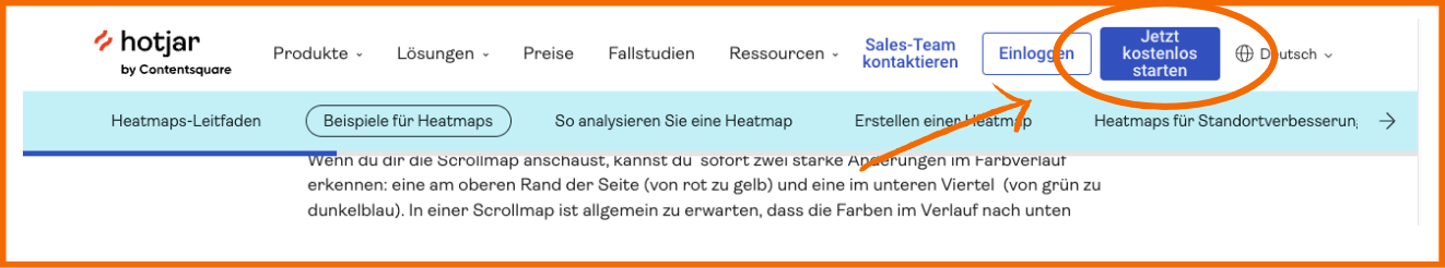 Hotjar verwendet einen fixierten Call-to-Action-Button, der Besucher dazu auffordert, ihr Produkt zu nutzen indem sie „Jetzt kostenlos starten“. Quelle: Hotjar.