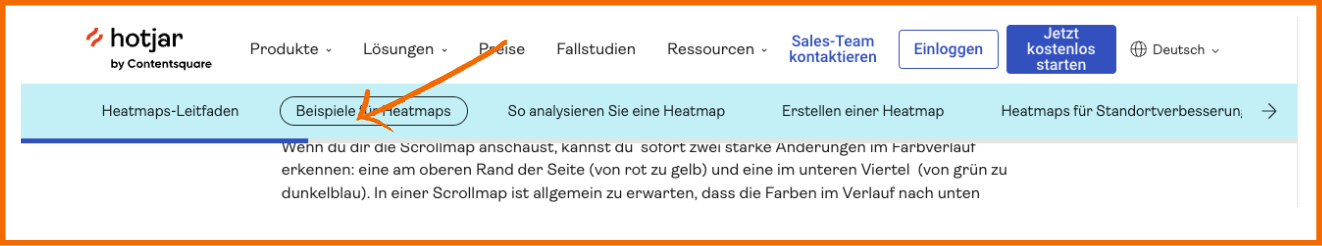 Starke Farbwechsel in der Scroll-Map, z.B. von grün zu blau, weisen darauf hin, dass an dieser Stelle viele deiner Nutzer:innen abspringen. So lässt sich ermitteln, welche Inhalte optimiert oder weiter nach oben verschoben werden sollten, um die User Experience und Conversion zu verbessern.