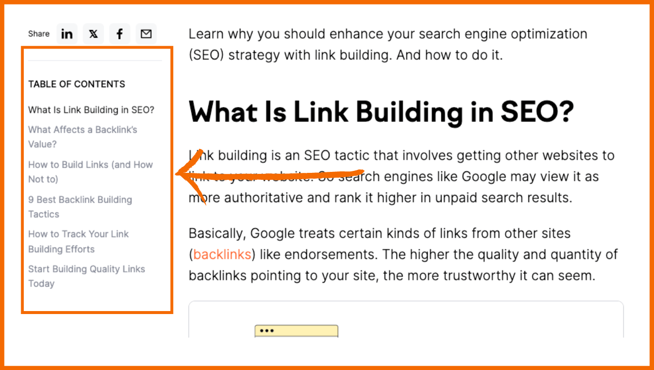 Semrush verwendet eine Inhaltstabelle, um das Navigieren zu erleichtern sowie zu signalisieren, dass es noch mehr interessanten Content unten gibt, welches zum weiterscrollen verleitet. Quelle: Semrush.
