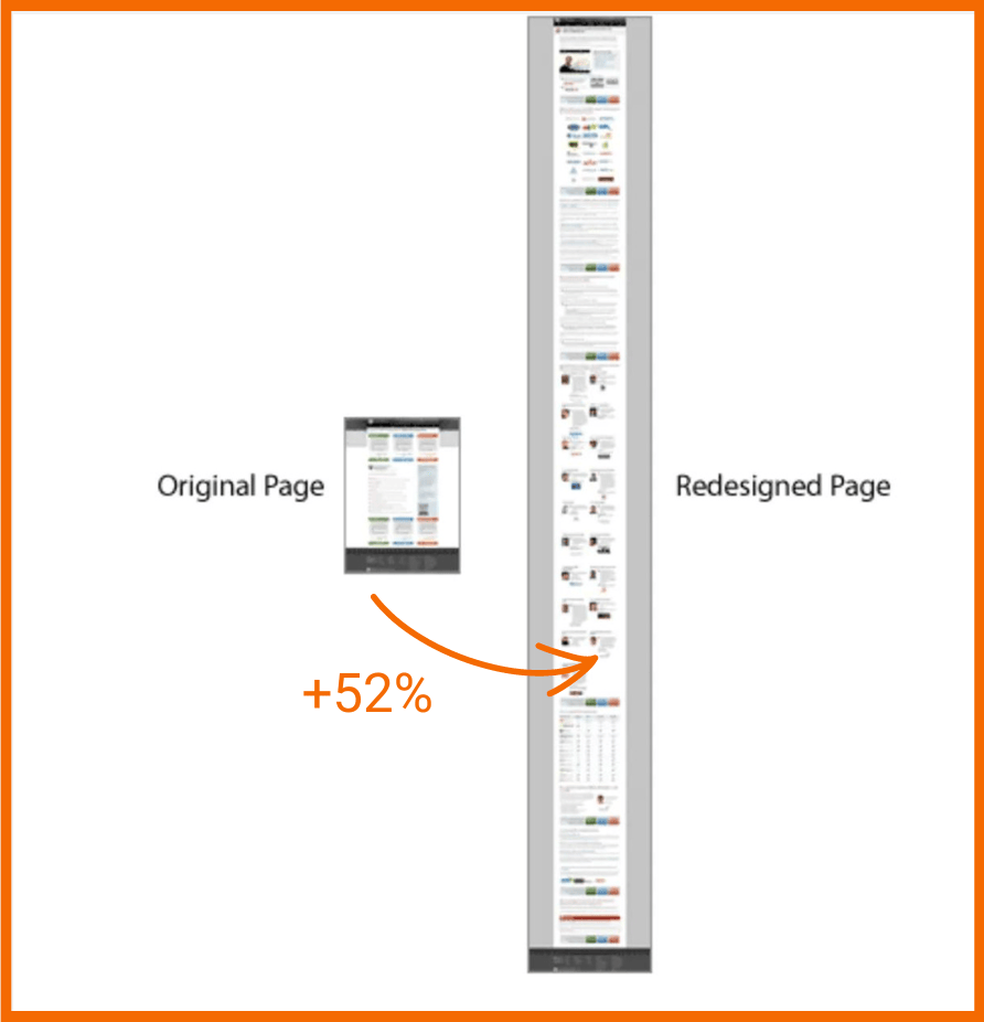 Vergleich der Performance von Moz’s ursprünglicher kürzeren Website mit der neuen Long-Scrolling-Website, die 52% mehr Conversions generiert hat. Quelle: Moz Case Study.
