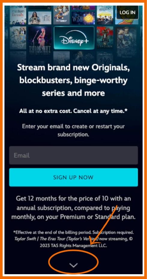 Disney verwendet einen Pfeil, um darauf hinzudeuten, dass es unten noch mehr Content gibt. Quelle: Conversion Rate Experts.