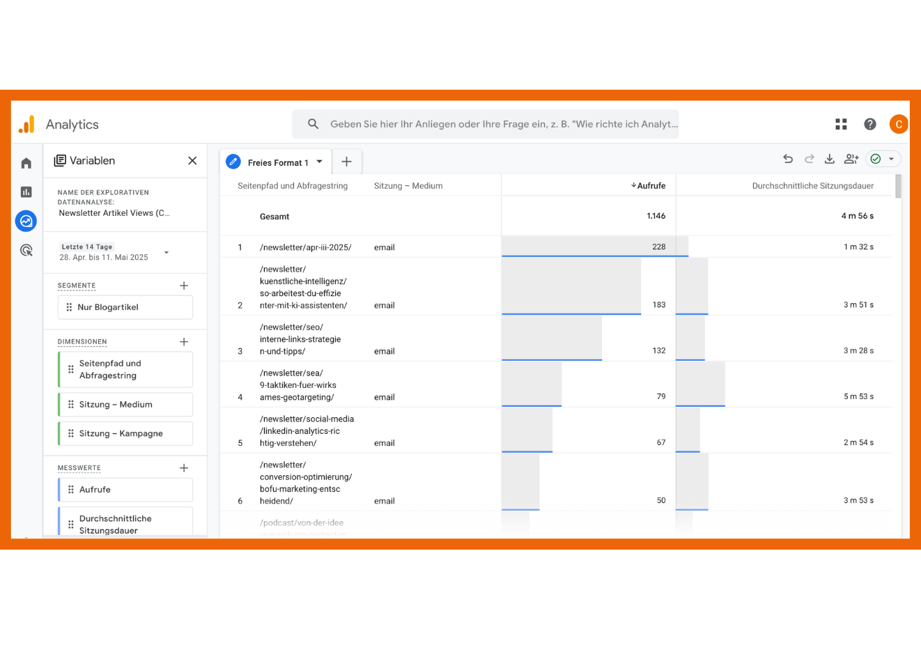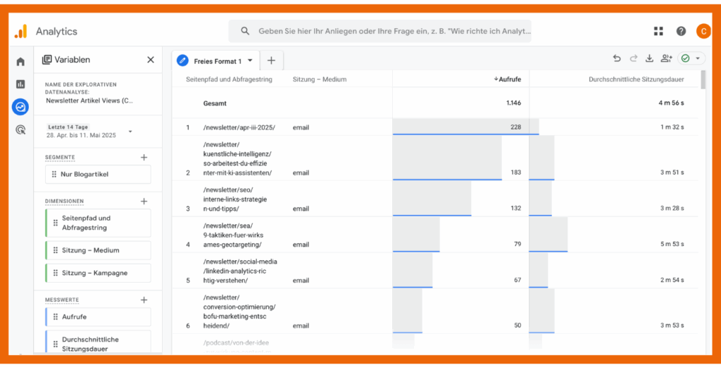 In Google Analytics 4 kannst du beispielsweise eigene Berichte erstellen, um die Performance deiner Newsletter Artikel zu messen, zum Beispiel wie viele Aufrufe jeder einzelne Artikel erzielt hat.