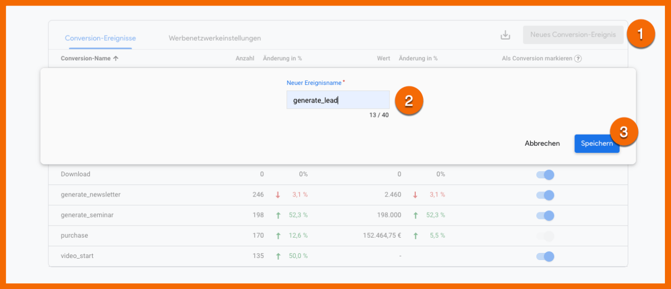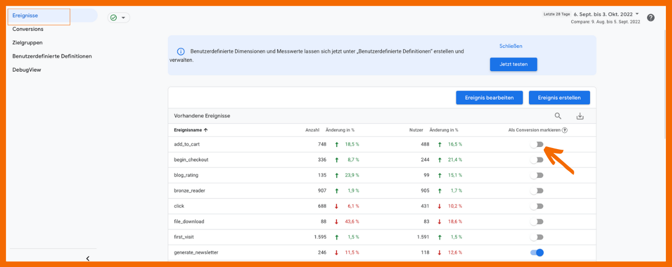 - Markiere das Ereignis als Conversion auf der Registerkarte „Ereignisse“.