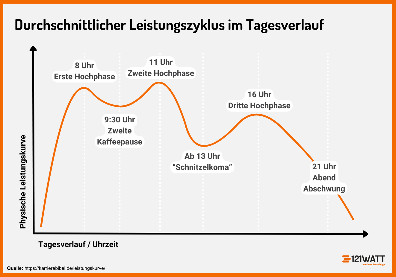 Hier siehst du den durchschnittlichen Leistungszyklus im Tagesverlauf. Erste Hochphase um 8 Uhr, Zweite Kaffeepause um 9:30, Zweite Hochphase um 11 Uhr, Ab 13 Uhr Schnitzelkoma, dritte Hochphase um 16 Uhr und ab 21 Uhr Abend Abschwung.