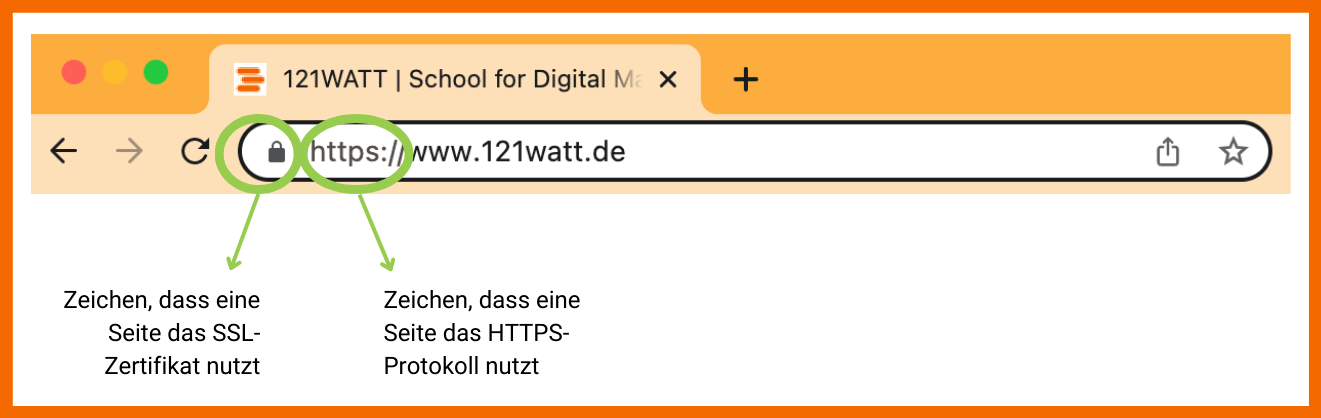 • Sicherheit: Kundinnen und Kunden brauchen Sicherheit. Sie wollen sichergehen, dass Daten, die sie an dich weitergeben, nicht abgegriffen werden können. Das mindeste ist, dass du mit dem HTTPS-Protokoll arbeitest und ein SSL-Zertifikat verwendest. Dass eine Website diese Maßnahmen vornimmt, erkennst du an der URL und an dem kleinen Schloss in der URL-Zeile.