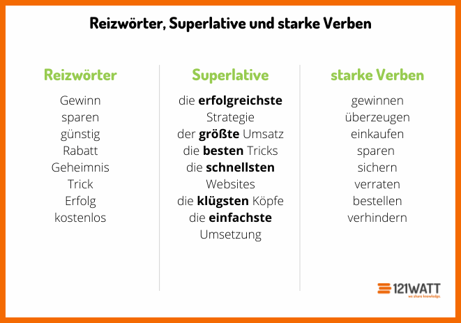 Besonders im B2B-Bereich fällt es oft schwer, Emotionen zu triggern. Dann kannst du auf bestimmte Reizwörter und Superlative zurückgreifen, welche die Aufmerksamkeit auf sich ziehen: