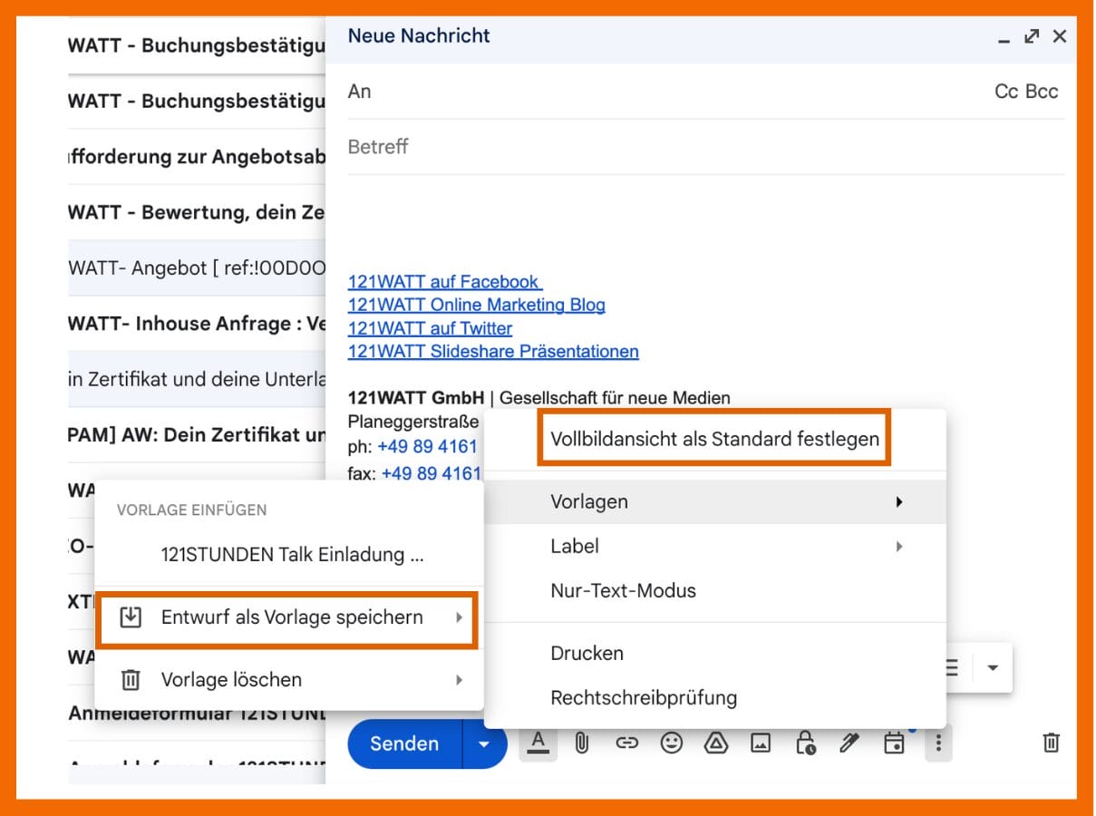 3. Jetzt kannst du die eigentliche Vorlage erstellen. Diese verfasst du im normalen E-Mail Editor und gehst anschließend über die 3-Punkte auf “Vorlagen” und dann “Entwurf als Vorlage speichern”. Dann wählst du noch einen passenden Titel.