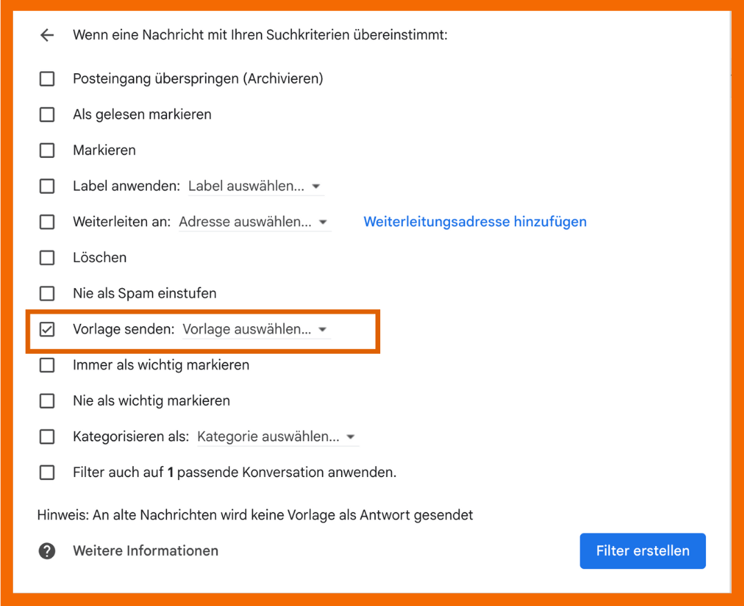 4. Nachdem die Vorlage angelegt ist, musst du nun einen Trigger setzen, der das automatische Versenden der E-Mail auslöst. Gehe hierfür wieder in die Einstellungen und diesmal in den Reiter “Filter und blockierte Adressen”. Wähle “neuen Filter erstellen”, gebe die relevanten Filterkriterien für deinen Anwendungsfall ein und wähle unter “Vorlage senden” die passende Vorlage. Schon hast du deine erste Auto replay E-Mail angelegt.