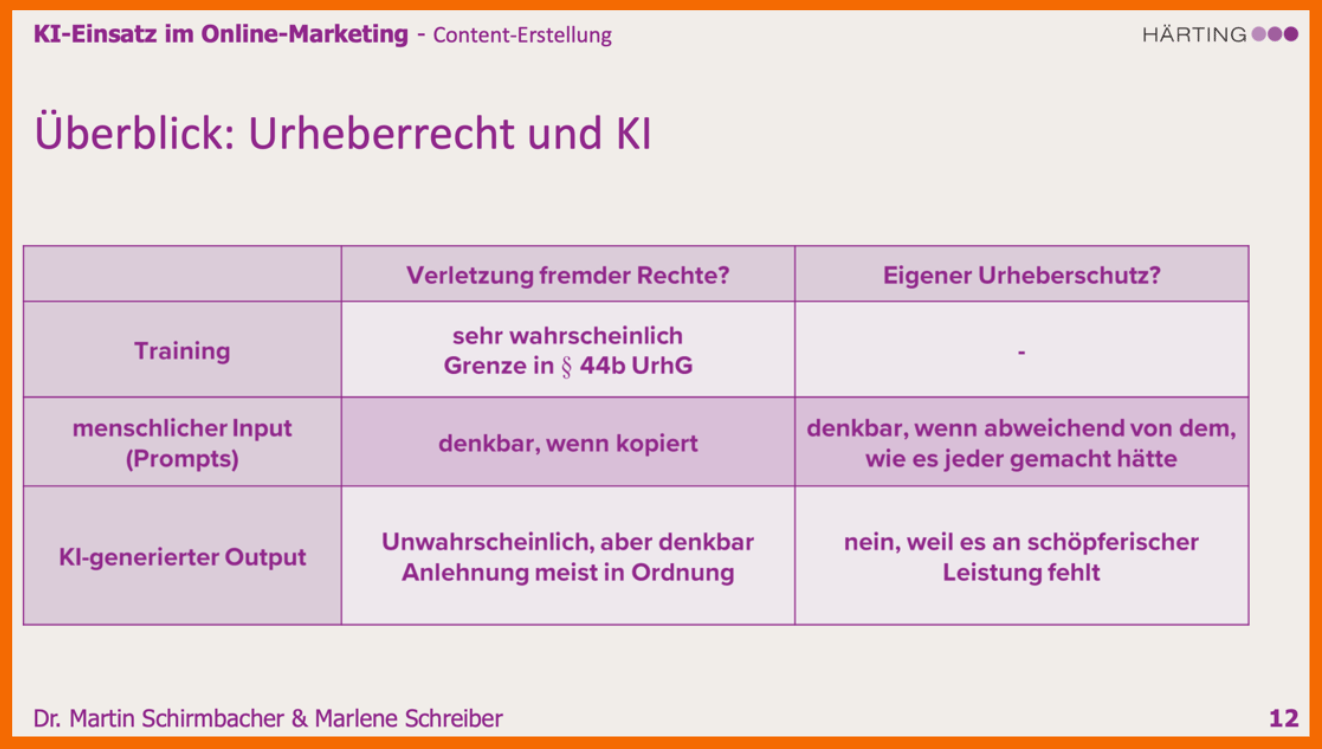 Schauen wir uns erst einmal an, welche rechtlichen Aspekte bei der Nutzung einer KI wie beispielsweise ChatGPT in Deutschland berührt werden. Marlene Schreiber und Dr. Martin Schirmbacher von der Rechtsanwaltskanzlei HÄRTING haben uns im Rahmen ihres Vortrags auf der SMX einen guten Überblick gegeben: