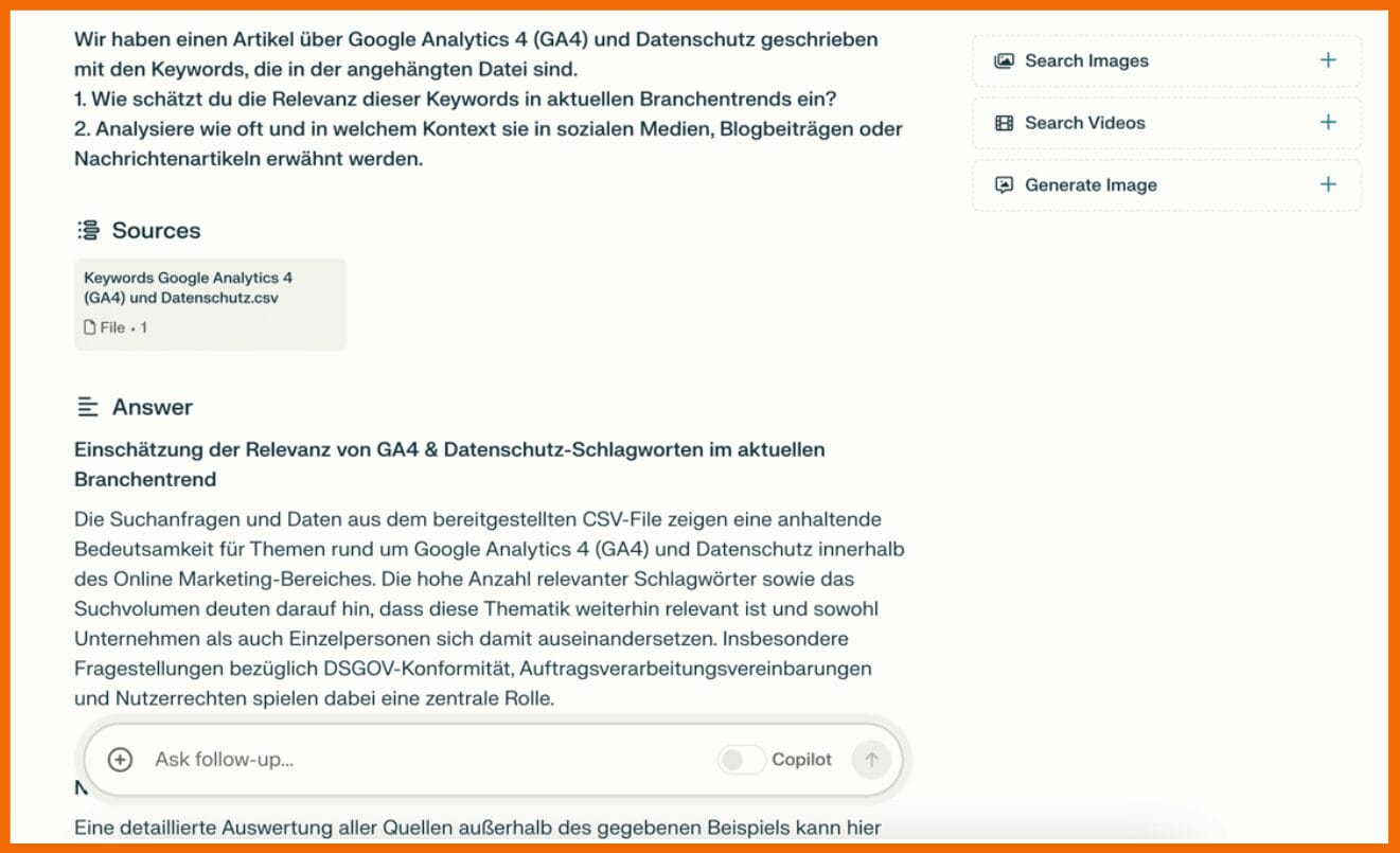 Perplexity kann dir helfen, datengetriebene Einsichten als Grundlage für fundierte Entscheidungen und Strategien zu erhalten. Durch die Analyse großer Datenmengen kann Perplexity AI bedeutende Muster und Korrelationen erkennen, was dir ein tieferes Verständnis deiner Kundschaft, Konkurrenten und Markttrends vermitteln kann. Als Basis-Daten kannst du dabei Informationen aus dem Netz wählen oder aber auch deine eigenen Daten bzw. Dateien bei Perplexity hochladen und als Grundlage der Analyse verwenden.