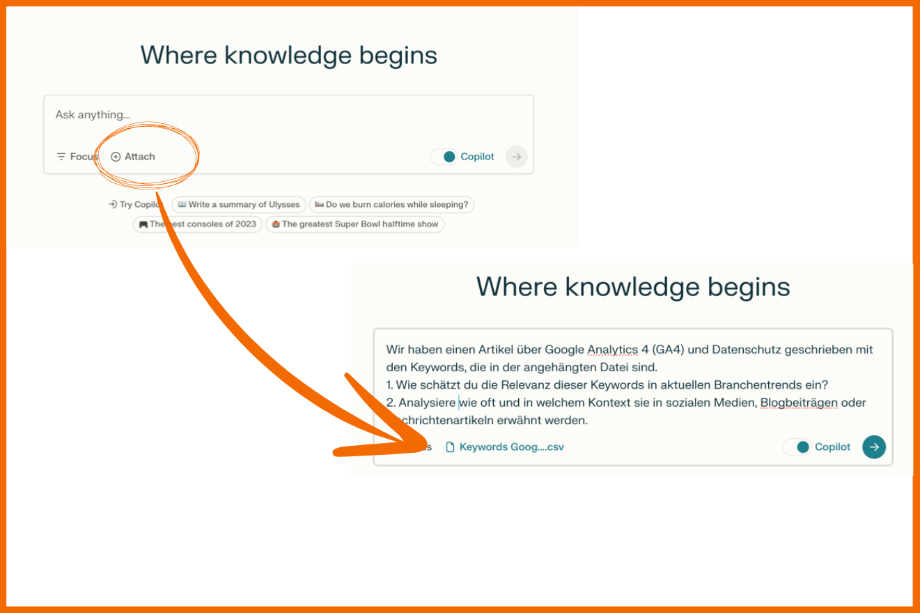 Über “Attach” kannst du deine Datei hochladen. Stelle dann deine Frage oder Aufgabe, die du von Perplexity gelöst haben möchtest.
