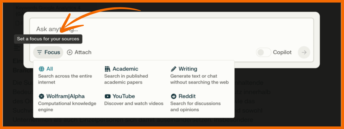 Die Fokussuche in Perplexity AI ermöglicht es dir, deine Suche auf bestimmte Domänen wie Wikipedia, Reddit, YouTube, Nachrichtenartikel und wissenschaftliche Arbeiten zu beschränken. Dies hilft dabei, die Genauigkeit der Suchergebnisse zu erhöhen, indem es die Informationsquelle auf relevante und zuverlässige Inhalte einschränkt. Du kannst damit deine Anfrage gezielt auf Bereiche richten, die für deine spezifischen Informationsbedürfnisse am relevantesten sind, was dir eine effizientere und zielgerichtete Suche ermöglicht.
