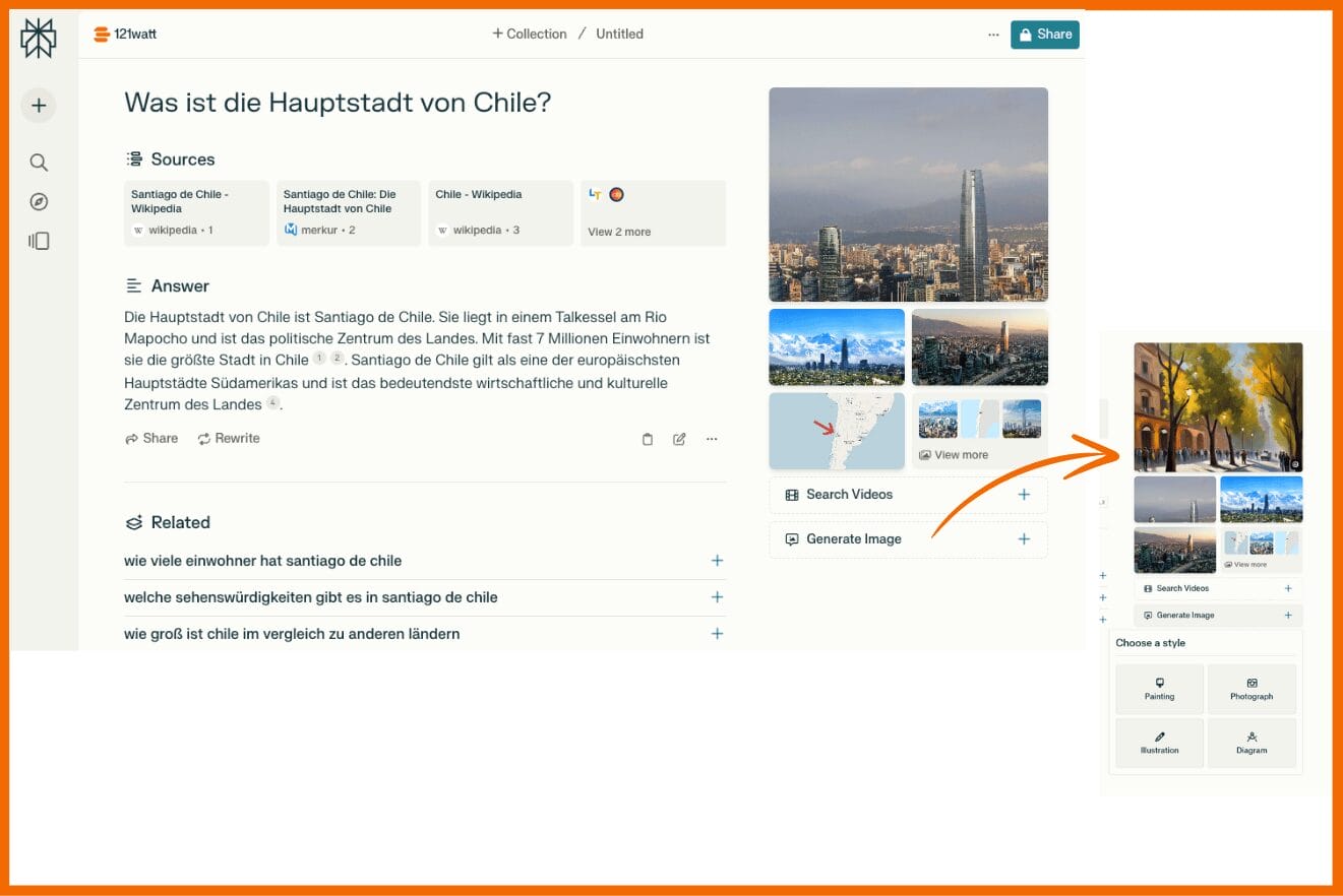 Wenn du beispielsweise fragen möchtest: „Was ist die Hauptstadt von Chile?“, liefert dir eine herkömmliche Suchmaschine in der Regel eine Liste von Webseiten, die Informationen über Santiago enthalten könnten. Perplexity hingegen antwortet direkt mit „Die Hauptstadt von Chile ist Santiago“ und kann dir zusätzliche Informationen liefern, wie etwa die Bevölkerungszahl oder bedeutende Sehenswürdigkeiten, wenn du weiterfragst.