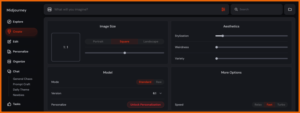 Im Zentrum der neuen Benutzeroberfläche steht das Texteingabefeld mit dem Platzhalter „What will you imagine?“. Hier gibst du – wie gewohnt – deinen Bildprompt ein. Doch anders als früher endet deine Arbeit nicht mehr mit einem langen String aus Befehlen und Parametern. Die meisten Einstellungen, die du früher direkt im Prompt ergänzt hast, steuerst du jetzt separat über die GUI.