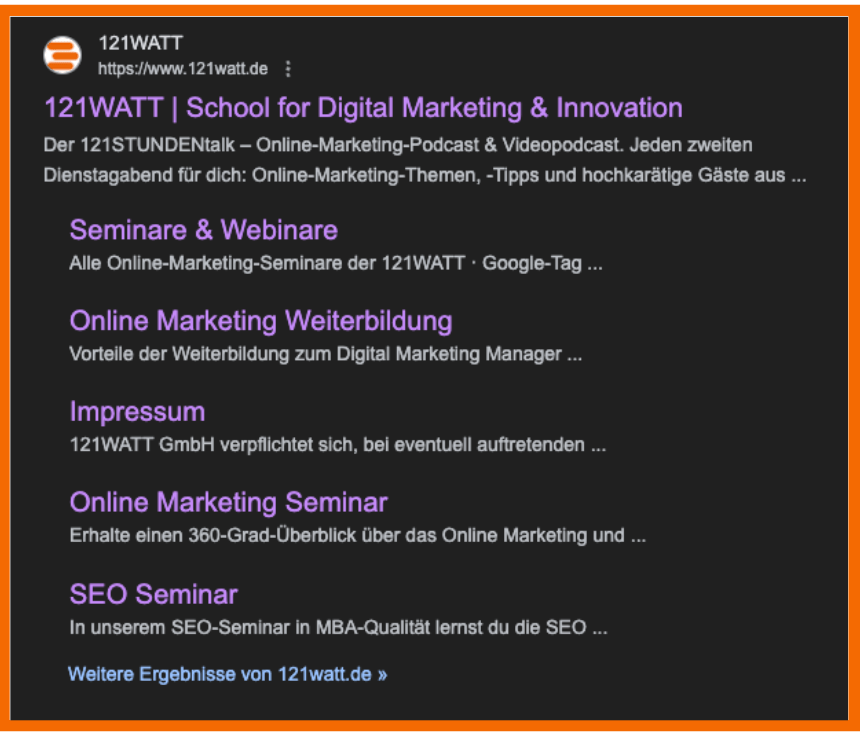 Sitelinks sind von Google automatisch generierte Links unter deinem Hauptlink, die Nutzer:innen schnellen Zugriff auf wichtige Unterseiten bieten.