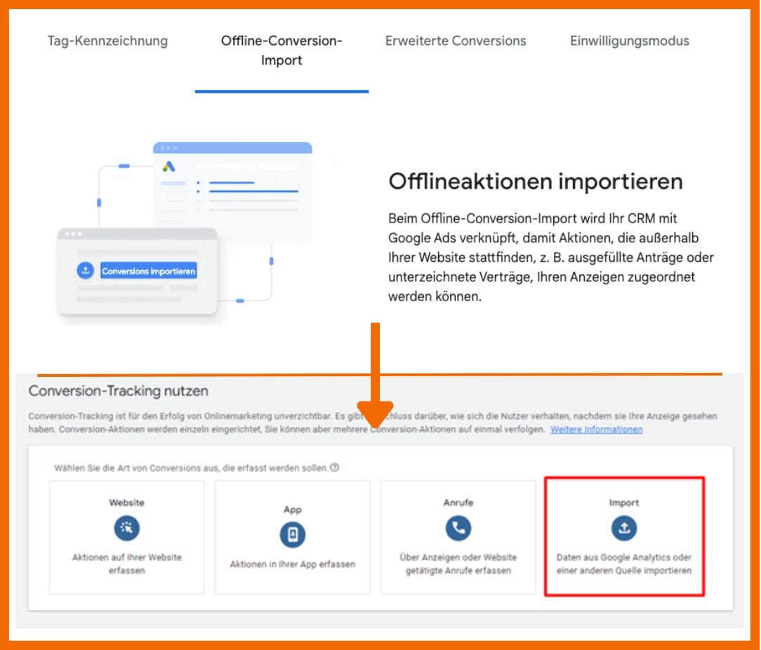 In den Einstellungen kannst du unter Conversion und Importe deine Offline-Conversion importieren. Quelle: https://www.seokratie.de/google-ads-b2b/