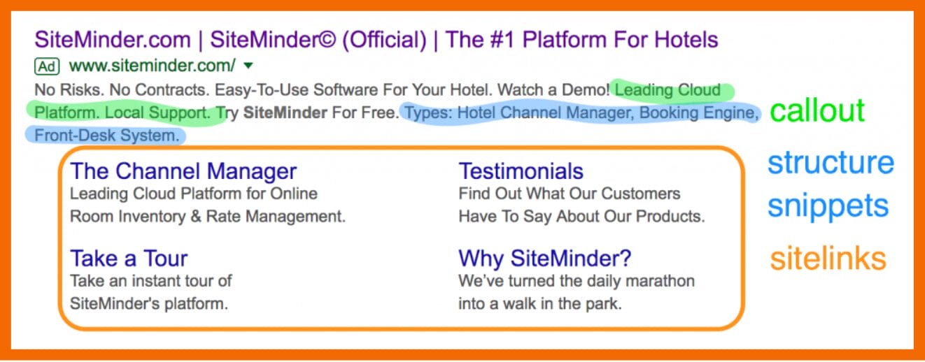 Beispiel-Anzeige mit Callout, Snippet und Sitelink Elementen. Quelle: https://www.vazooky.com.au/r/ad-extensions/