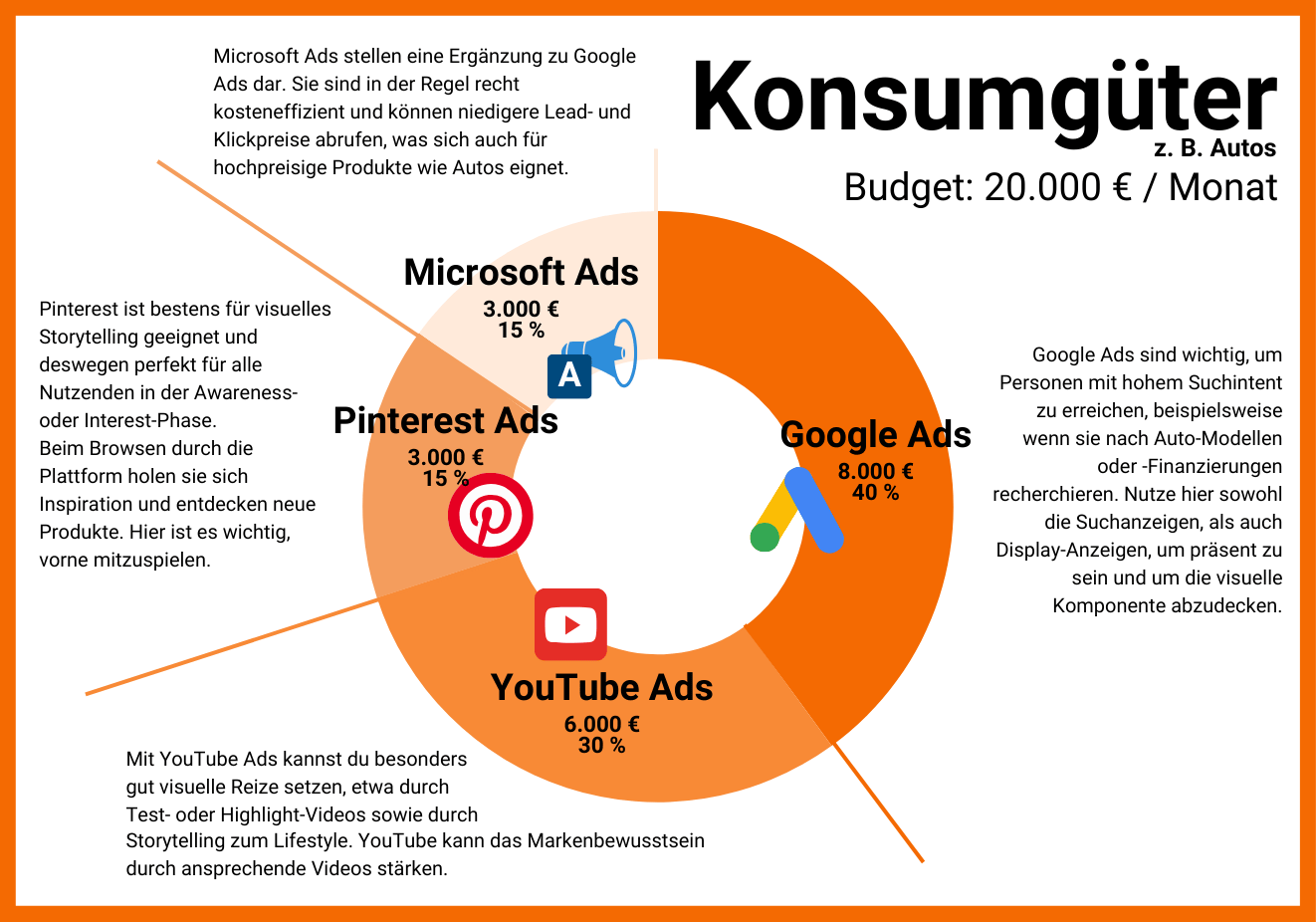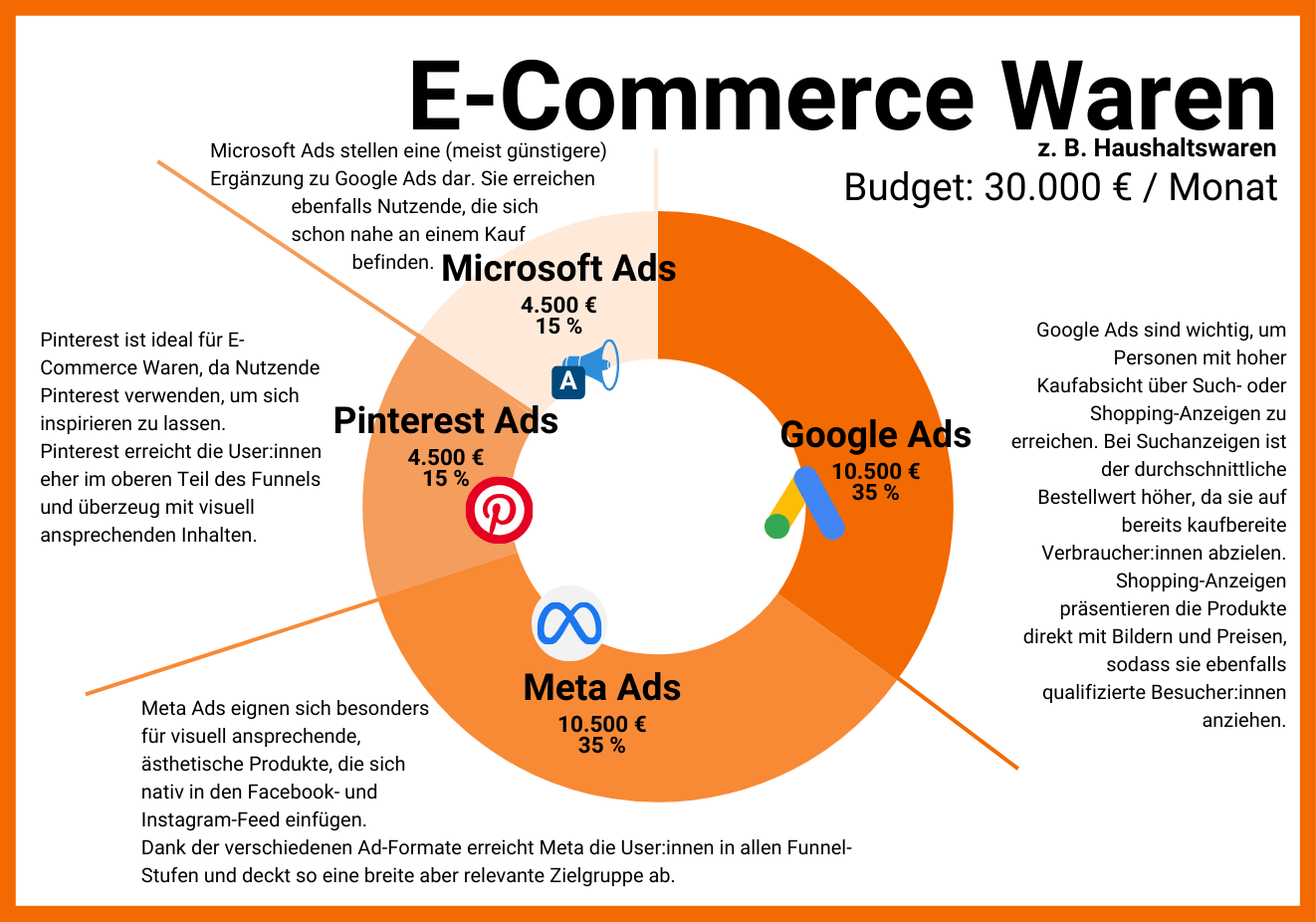 Im E-Commerce-Bereich empfiehlt sich eine ausgeglichene Verteilung des Budgets auf verschiedene Kanäle. Der Einsatz von Suchanzeigen, Social Ads und Anzeigen auf visuellen Plattformen sorgt dafür, dass alle Stufen des Sales Funnels abgedeckt werden.