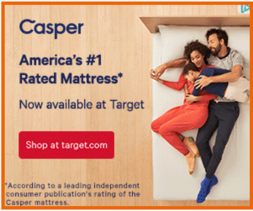 Casper ist eine erfolgreiche E-Commerce-Marke, die Matratzen, Kissen und andere Schlafprodukte vertreibt. Das Unternehmen nutzt Display-Anzeigen gezielt, um zeitlich begrenzte Angebote zu promoten und Kundenerfahrungen emotional zu inszenieren. Typisch sind Kampagnenmotive, die eine gemütliche, wohlfühlorientierte Schlafumgebung zeigen, oft kombiniert mit klaren Call-to-Actions wie „Shoppen Sie bei target.com“ und einem konkreten Rabatt.