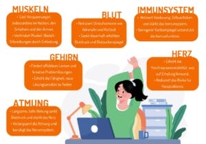 - Atemübungen: Nutze die 4-7-8-Technik, um Stress abzubauen: 4 Sekunden einatmen, 7 Sekunden den Atem halten und 8 Sekunden langsam ausatmen. Diese Übung beruhigt und stärkt die Konzentration.