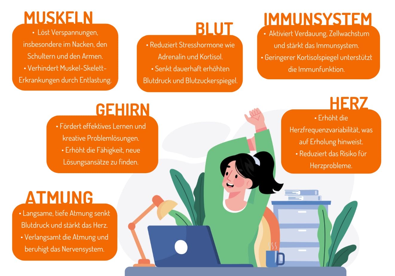 - Bewegung: Steh auf, dehne dich oder geh für ein paar Minuten an die frische Luft. Kurze Spaziergänge fördern die Durchblutung und geben dir neue Energie.