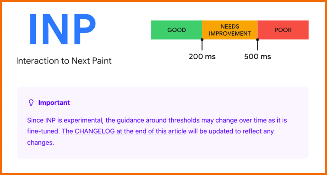 Bald könnte die neue – aktuell experimentelle Kennzahl – Interaction to Next Paint (INP) neuer Bestandteil der Core Web Vitals werden. Diese Metrik gibt dir Auskunft über die Reaktionsgeschwindigkeit deiner Webseite über den gesamten Besuch hinweg. INP könnte damit FID ersetzen. Denn beim First Input Delay geht es nur um die erste Interaktion, während der INP alle Interaktionen eines Seitenbesuchs berücksichtigt.