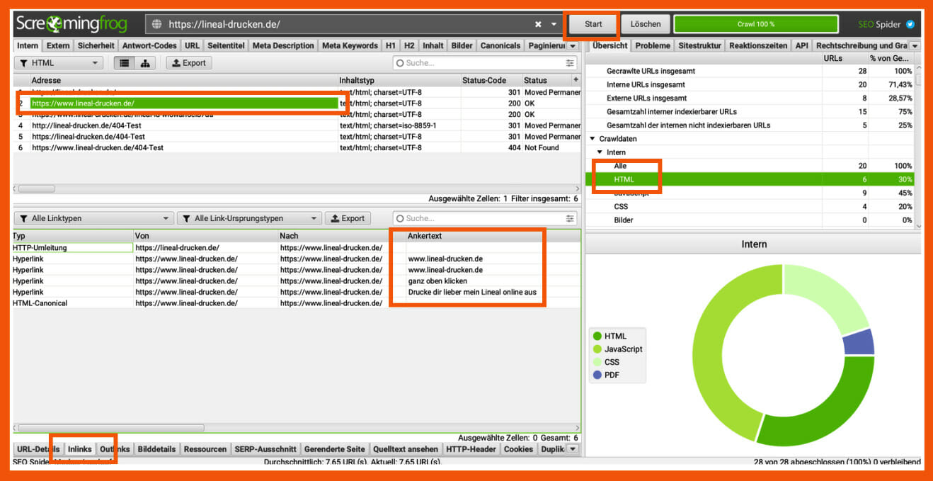 Öffne den ScreamingFrog, gib deine URL ein und starte den Crawl. Filtere dann nach HTML, klicke auf die Seite, die du sehen möchtest, und dann auf “inlinks” unten.