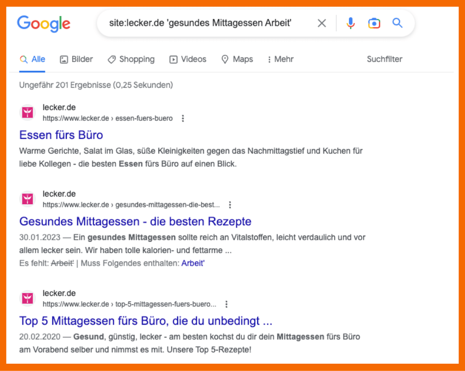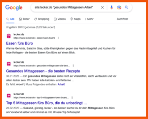 Das Beispiel oben zeigt dir, wie Google die auf der Lecker.de-Website veröffentlichten Inhalte zum Thema „gesund“ und/oder „Mittagessen und/oder Arbeit“ aufgelistet hat.