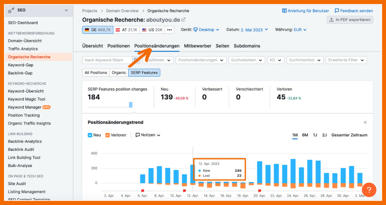 Außerdem hast du eine Vielzahl an Filtermöglichkeiten, um z. B. herauszufinden, welche Positionsveränderung es in den Top 20 gab. Du kannst auch oberhalb des Balkendiagramms auf SERP Features klicken, um zu sehen, welche Keywords dein Wettbewerber speziell dort verloren bzw. gewonnen hat.