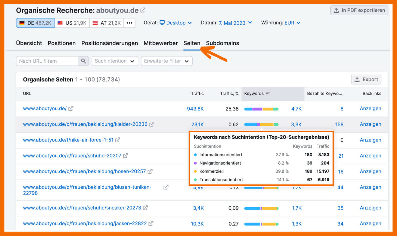 Wenn du wissen möchtest, welche Arten von Inhalten auf der Website einer Konkurrenz in den organischen Ergebnissen am erfolgreichsten sind, gehst du auf den Bericht Seiten.